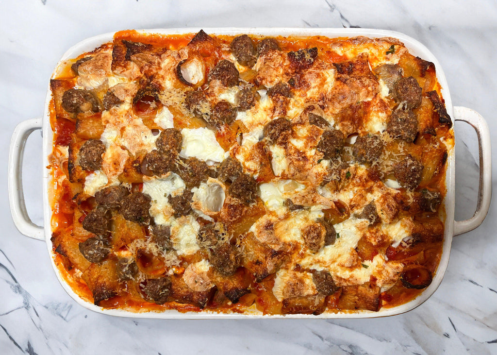 Dive into Pasta al Forno! An Italian comfort dish featuring rigatoni, ricotta, and layers of homemade meatballs and mozzarella cheese.