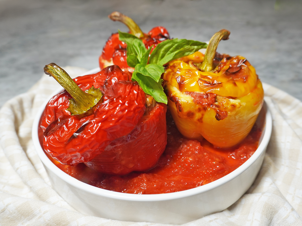 Enjoy these stuffed peppers made with Ciao Authentica Crushed Tomatoes, blending savory fillings and vibrant flavors for a delicious and hearty meal.