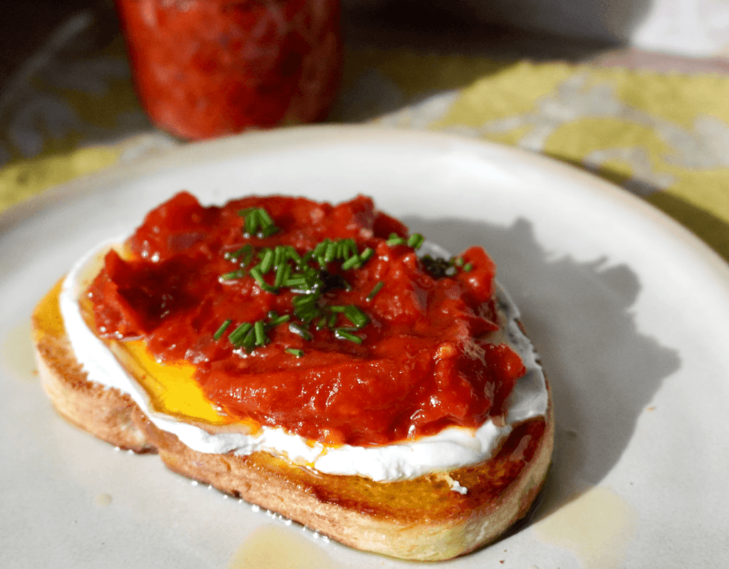 Savory-sweet tomato jam made with delicate Ciao Italian Whole Peeled Tomatoes—rich, unique flavor that makes the perfect addition to any dish.