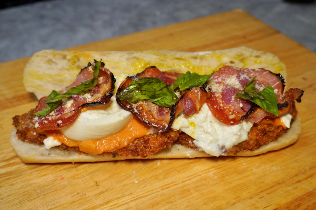 - Assemble the Vodka Parm Hero: cut open semolina bread, add fried chicken cutlets, ladle on hot Ciao Traditional Vodka Sauce, hand-tear Deliziosa Burrata over the top, and finish with crispy pancetta, fresh basil, and grated Pecorino Romano.