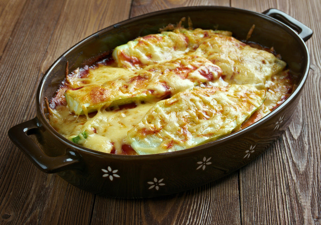 - Using a casserole dish, start building your parmigiana by coating the bottom with tomato sauce. Then, add fried zucchini, pecorino, and fresh mozzarella. Continue to do this until you have reached the top.
